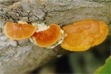 朱红栓菌危害多种阔叶树木等,引起木材腐朽。被侵害处开始呈橙色,后期为白色腐朽。在香菇、木耳栽培的段木上,常出现此菌,属食菌段木上常见的“杂菌”。